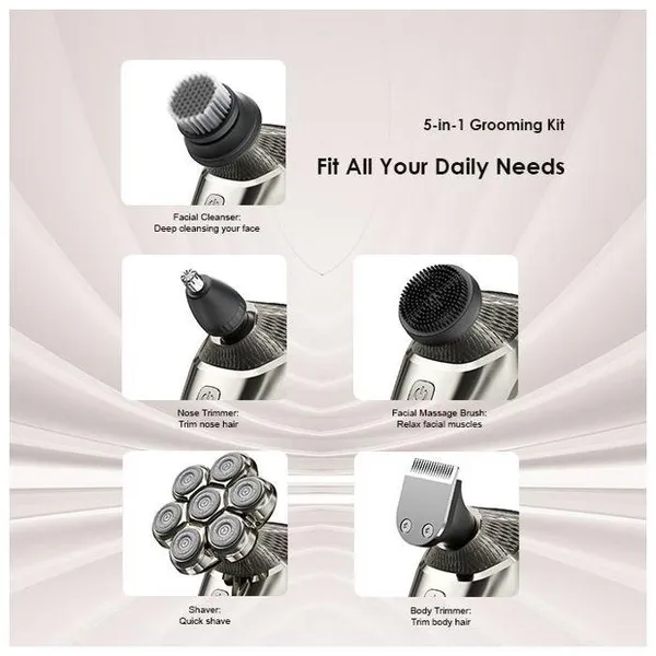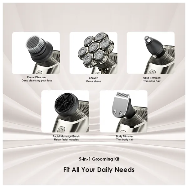 - 5-in-1 Grooming Kit: This all-in-one grooming kit includes a shaver for quick shaves, a hair clipper with guided combs for styling, a nose trimmer for trimming nose hair, a facial massage brush to relax facial muscles, and a facial cleanser for deep cleansing.