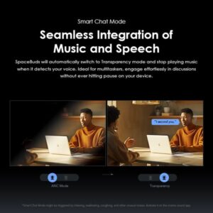 Need to talk without removing your earbuds? Just speak—SpaceBuds detects your voice, pauses the music, and activates Transparency Mode so you can chat easily.