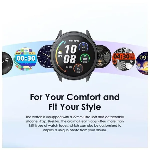 The Oraimo Watch 2R features a 22mm ultra-soft silicone strap for comfort and a customizable fit. Choose from over 150 watch faces available on the oraimo Health app or upload a unique photo to create a personalized display.